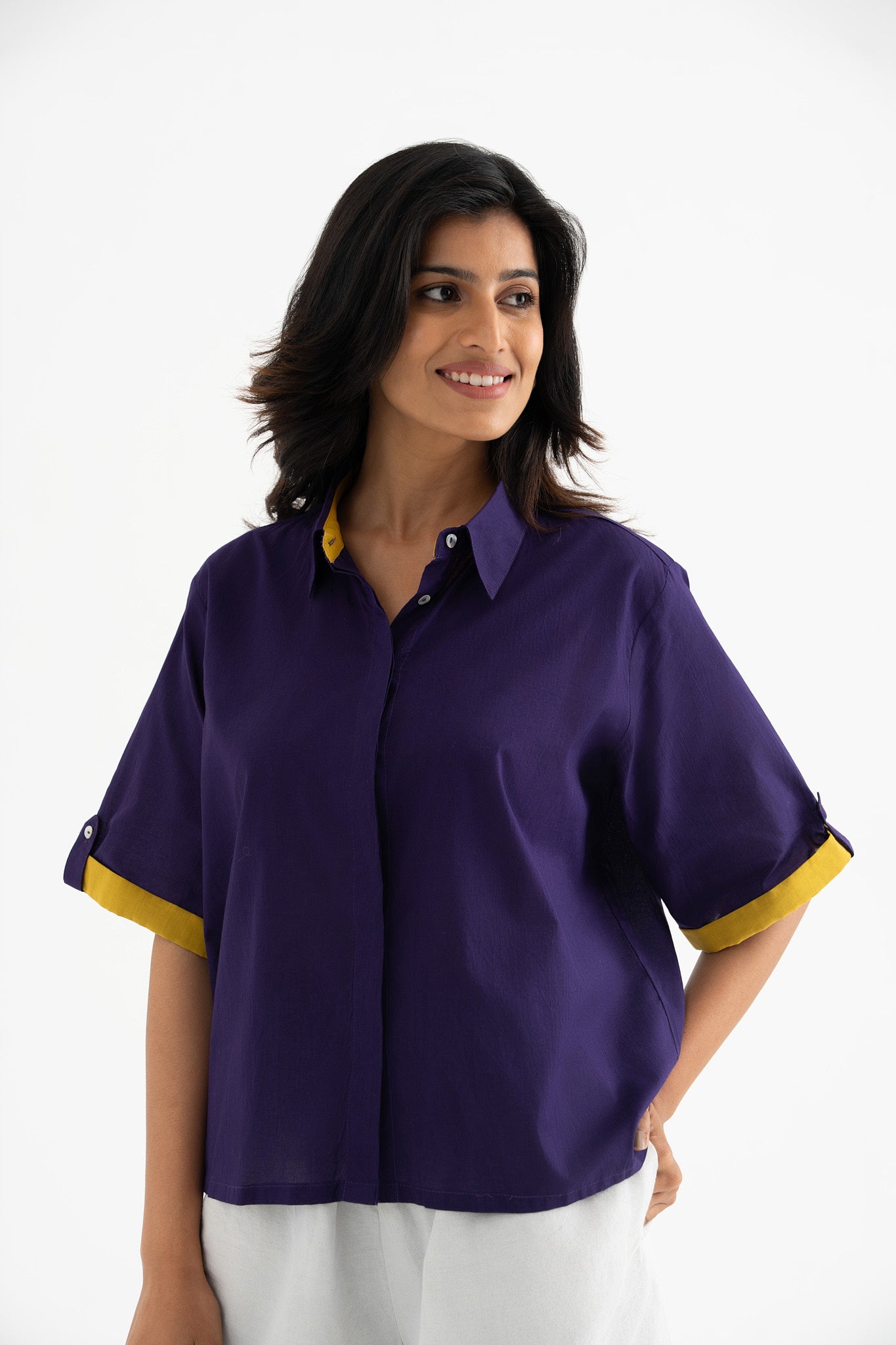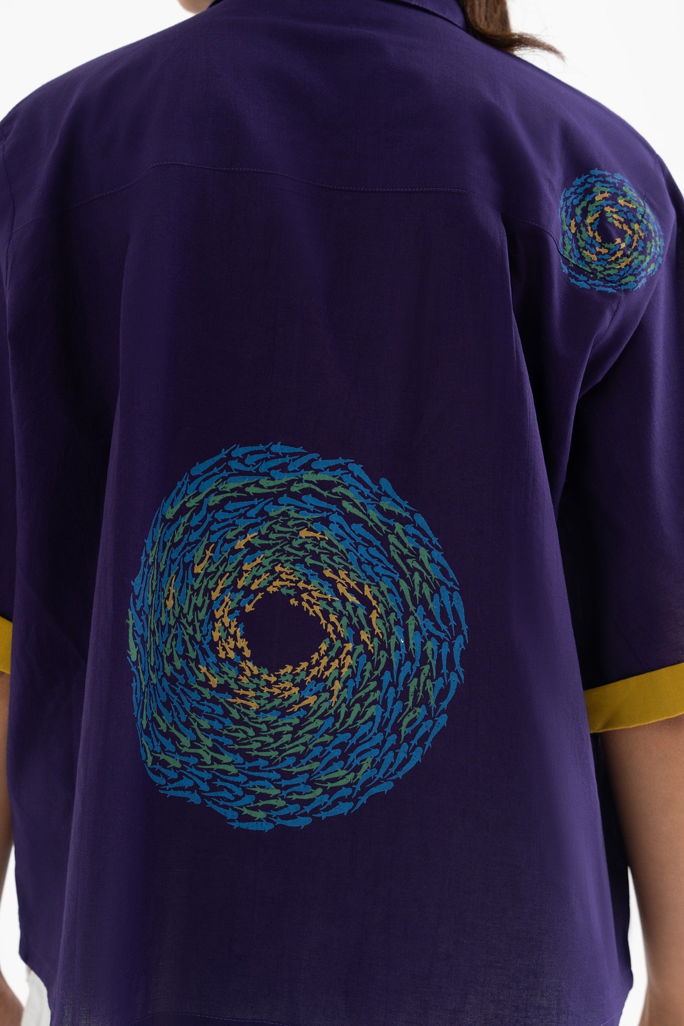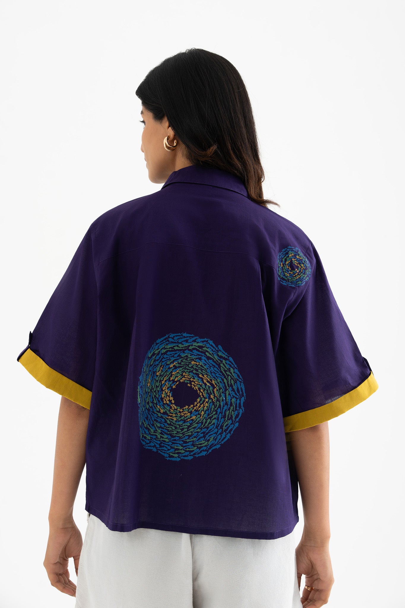 Elevate your wardrobe with this deep purple pure cotton collared shirt top, featuring a striking hand-block-printed swirl fish motif at the back. The contrasting inner collar and sleeve detail add a refined touch, making it a perfect blend of comfort and contemporary style.