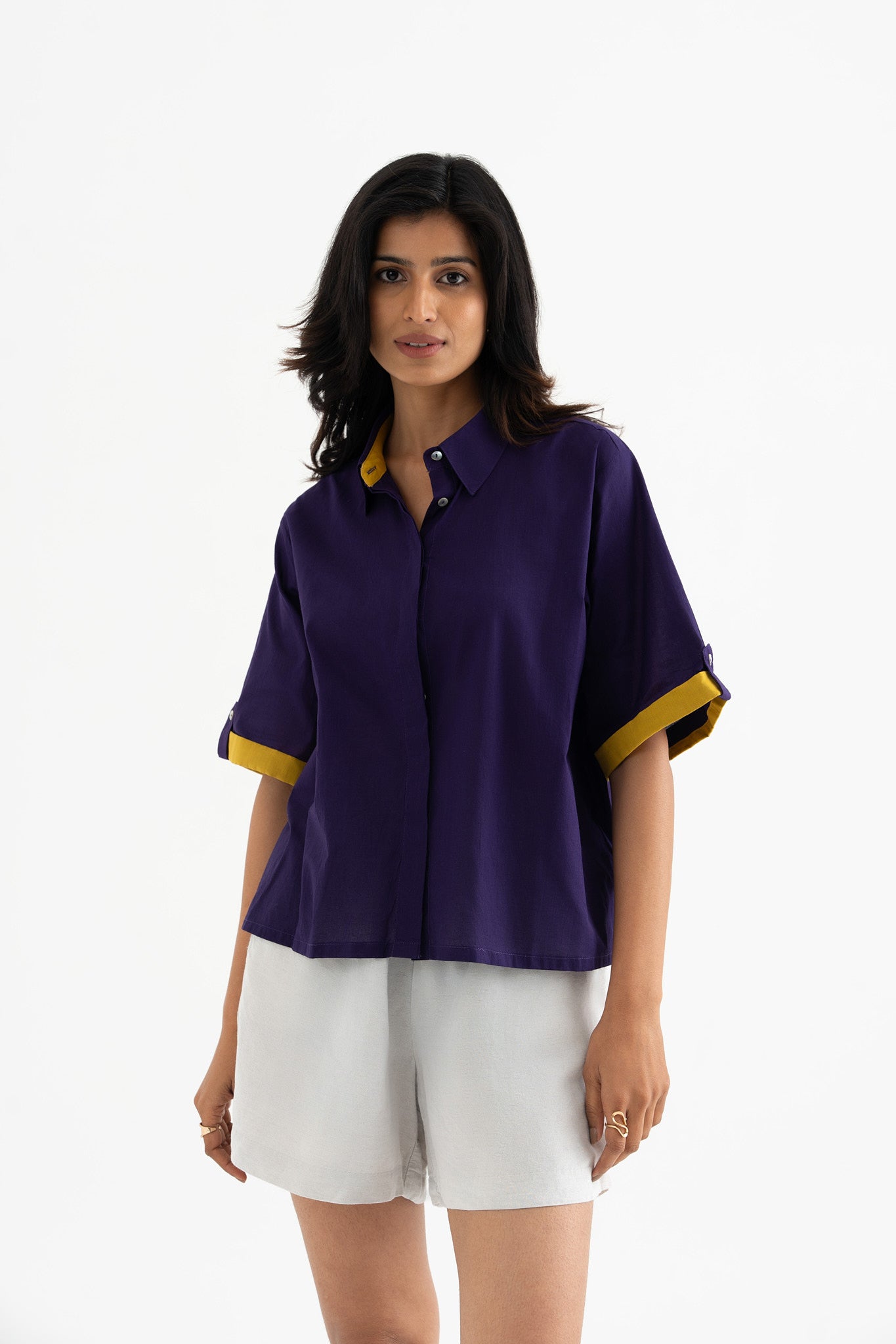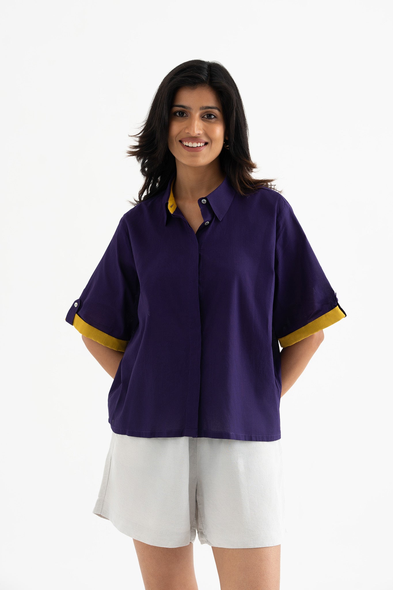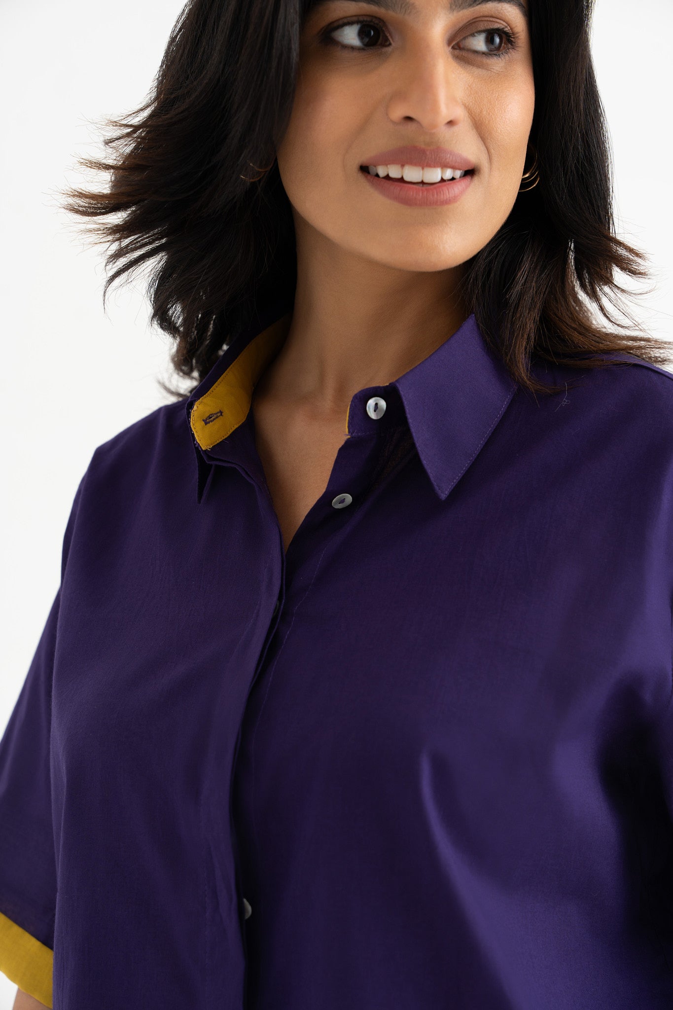 Elevate your wardrobe with this deep purple pure cotton collared shirt top, featuring a striking hand-block-printed swirl fish motif at the back. The contrasting inner collar and sleeve detail add a refined touch, making it a perfect blend of comfort and contemporary style.